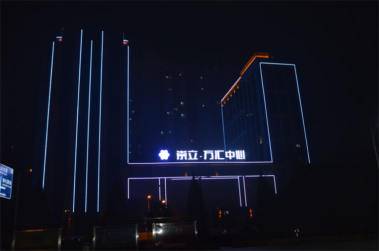 亮化樓體左側(cè)立面效果,主體采用線條燈勾勒輪廓,十字星光燈點(diǎn)綴測(cè)樓體