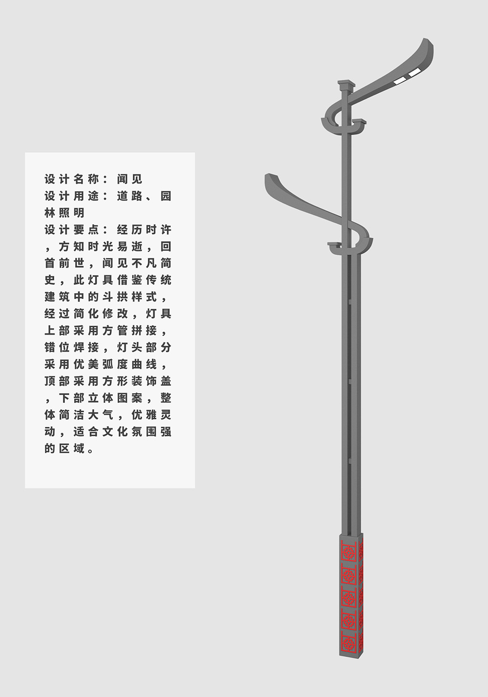 設(shè)計(jì)要點(diǎn):經(jīng)歷時(shí)許,方知時(shí)光易逝,回首前世,聞見(jiàn)不凡簡(jiǎn)史,此燈具借鑒傳統(tǒng)建筑中的斗拱樣式,經(jīng)過(guò)簡(jiǎn)化修改,燈具上部采用方管拼接,錯(cuò)位焊接,燈頭部分采用優(yōu)美弧度曲線,頂部采用方形裝飾蓋,下部立體圖案,整體簡(jiǎn)潔大氣,優(yōu)雅靈動(dòng),適合文化氛圍強(qiáng)的區(qū)域。